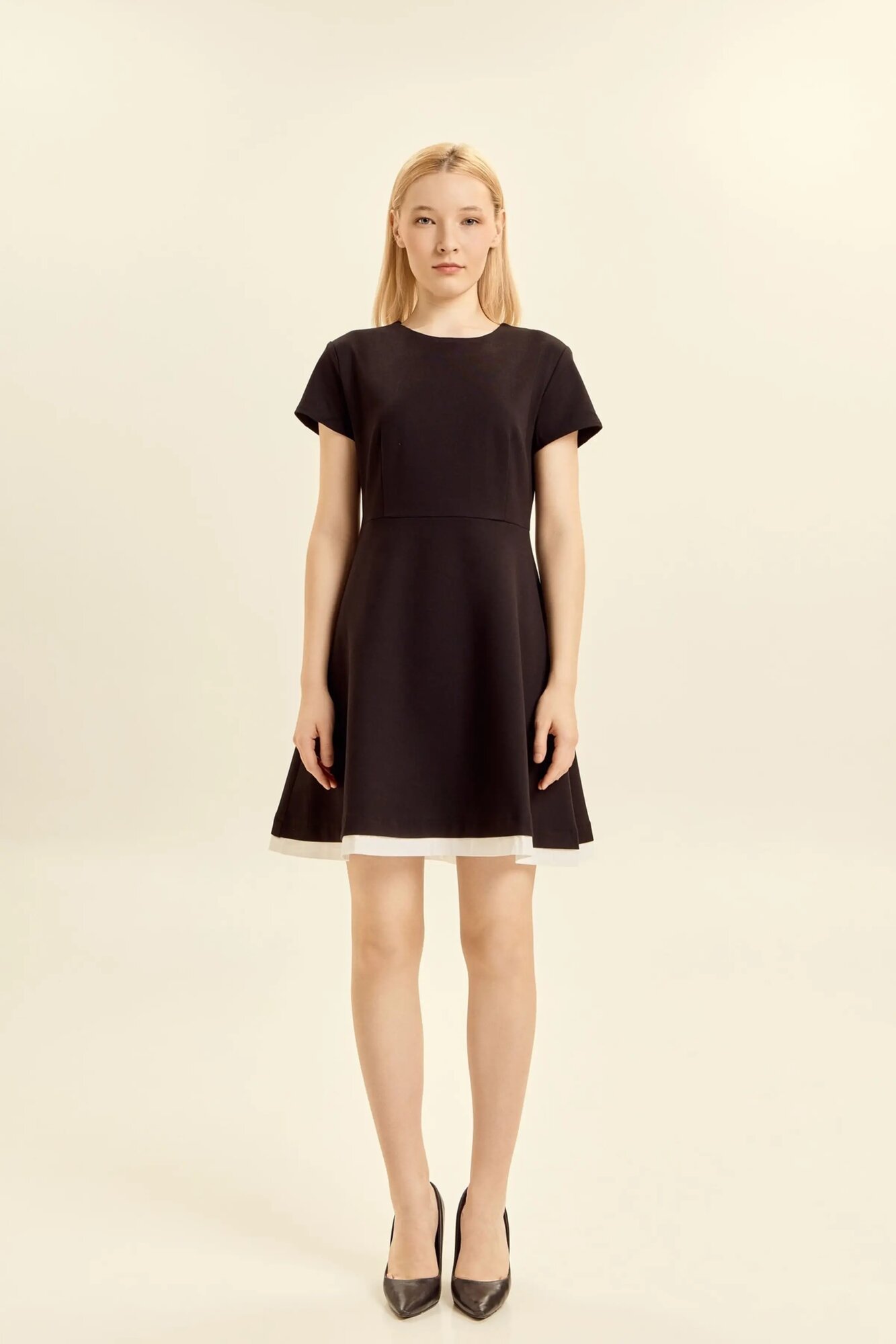 Платье выполнено в лаконичном и элегантном стиле, подходящем как для повседневных образов, так и для особых случаев. Модель имеет прямой лиф с аккуратными вытачками, которые подчеркивают фигуру, и плавно расклешённую юбку, создающую женственный силуэт. Короткие рукава обеспечивают комфорт и универсальность в носке, а круглый вырез придаёт образу сдержанность и элегантность. Сзади платье застёгивается на потайную молнию, что делает посадку аккуратной и удобной. Низ украшен контрастной отделкой, создающей многослойный эффект и добавляющей наряду утончённости. Такая модель станет основой гардероба для самых разных ситуаций.