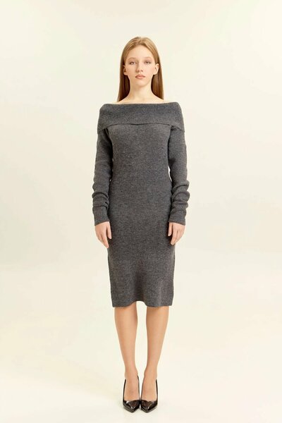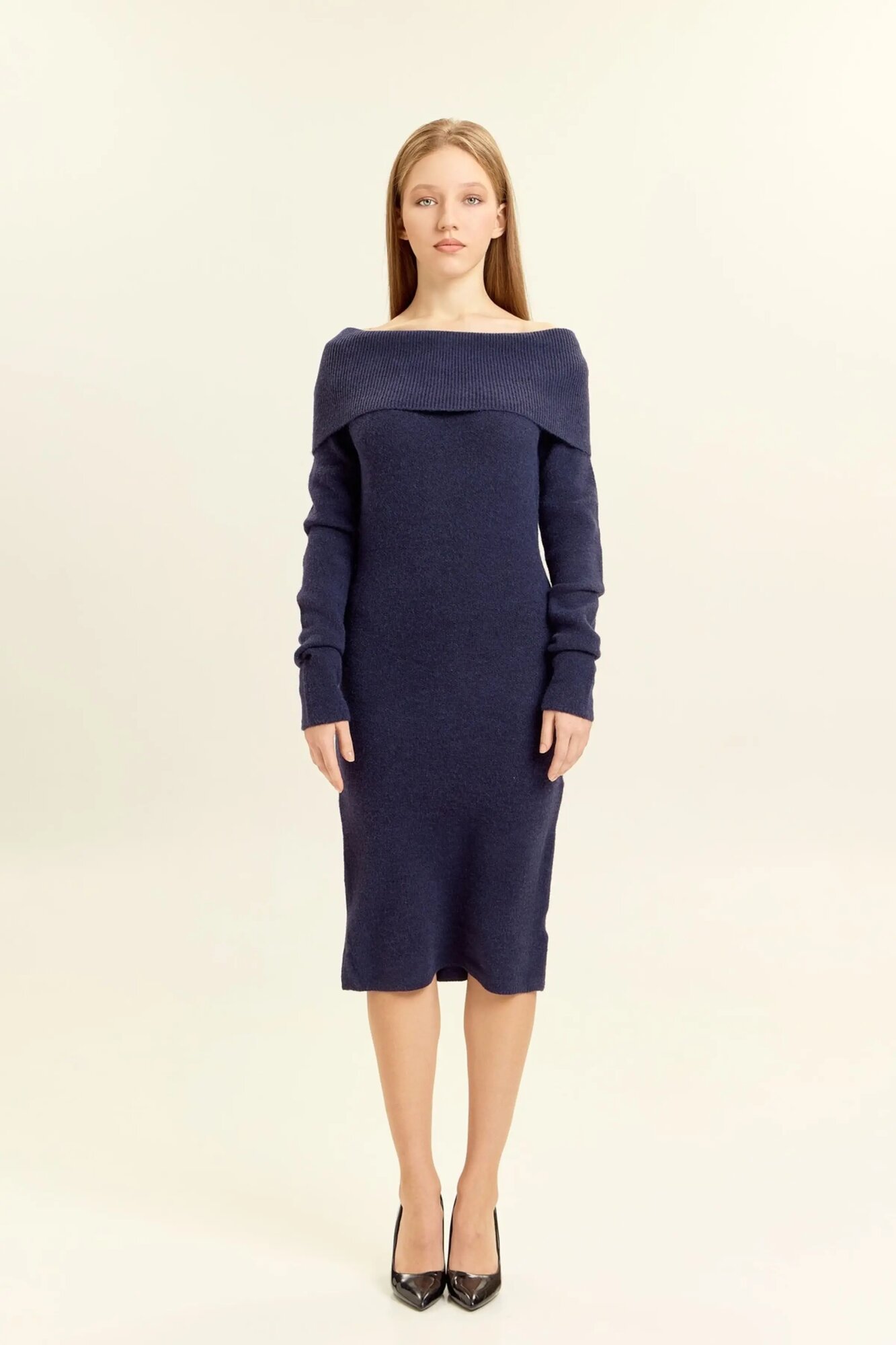 Платье из мягкого трикотажа длины миди отличается элегантностью и универсальностью. Облегающий силуэт подчеркивает фигуру, а широкий отворот на линии плеч придает образу выразительный акцент. Благодаря такому дизайну платье можно носить с открытыми плечами, создавая утонченный и женственный стиль. Длинные рукава добавляют гармонии и делают модель подходящей для прохладного времени года. Трикотажное полотно приятно к телу, эластично и обеспечивает комфорт при носке. Лаконичный крой позволяет легко комбинировать платье с обувью на каблуке для вечернего выхода или с более сдержанными аксессуарами для повседневных образов. Универсальный характер модели делает её удачным выбором для создания как строгого, так и романтичного стиля.