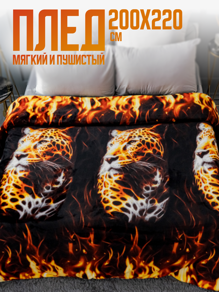 Плед 200х220 Павлина Лео в огне велсофт евро на кровать на диван