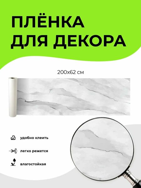 Преобразите свою кухню, ванную или любую другую комнату с нашей самоклеящейся пленкой мрамор! Пленка для декора станет идеальным решением для тех, кто хочет добавить элегантности и современности в свой дом. Изготовленная из качественного ПВХ материала с глянцевой поверхностью, она легко наносится на стены и мебель, обеспечивая надежное и долговечное покрытие. Легкая в применении, прочная и долговечная, она станет вашим незаменимым помощником в создании роскошного интерьера без больших затрат. С размерами 200 х 62 см, эта декоративная пленка для мебели позволяет украсить значительную площадь, придавая вашему пространству свежесть и глубину. Реалистичный мраморный рисунок не только выглядит стильно, но и создает атмосферу уюта и роскоши. Наша самоклейка для мебели особенно идеально подходит для кухни! Используйте ее, чтобы оклеить проблемные зоны, защищая их от царапин и жирных пятен. Эта самоклеящаяся пленка на мебель станет вашим верным помощником в создании красивого и функционального пространства. Не упустите возможность обновить свой интерьер с помощью нашей самоклеящейся пленки для мебели и кухни!