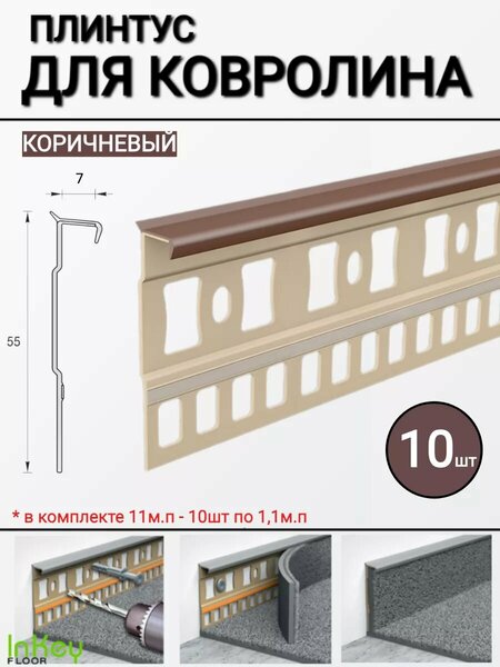 Комплект из плинтуса для ковролина - 10шт по 1,1м Плинтус Ideal представляет собой идеальное дополнение для вашего интерьера, особенно если вы используете ковролин для отделки пола. Наша продукция сочетает в себе элегантный дизайн, прочность и функциональность, делая вашу комнату не только красивой, но и практичной. Одним из наших главных преимуществ является долговечность. Используя высококачественные материалы, мы создаем плинтус, который будет служить вам долгие годы, не теряя своей первоначальной привлекательности. Кроме того, он легко устанавливается и не требует особых навыков или инструментов. Вы сами можете справиться с этой задачей за считанные минуты, экономя свое время и силы. Наши плинтусы доступны в разных размерах, цветах и отделках, что позволяет подобрать идеальное решение для вашего интерьера. Вы можете выбрать плинтус, который идеально сочетается с вашим ковролином, создавая гармоничную и завершенную картину. Кроме того, они легко регулируются по высоте, что позволяет подгонять их под различные уровни пола. Мы заботимся о вашем комфорте и безопасности, поэтому наша продукция отличается отсутствием острых углов и заусенцев. Поверхность плинтуса гладкая и приятная на ощупь, исключая возможность неприятных травм или повреждений. Выбирая плинтус для своего ковролина, вы делаете правильный выбор. Наша продукция сочетает в себе качество, стиль и функциональность, принося вам радость и удовлетворение. Не упускайте возможность создать прекрасное пространство в вашем доме.