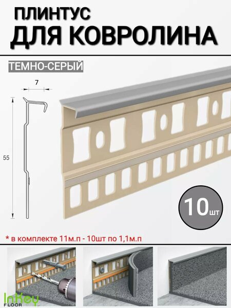 Комплект из плинтуса для ковролина - 10шт по 1,1м Плинтус Ideal представляет собой идеальное дополнение для вашего интерьера, особенно если вы используете ковролин для отделки пола. Наша продукция сочетает в себе элегантный дизайн, прочность и функциональность, делая вашу комнату не только красивой, но и практичной. Одним из наших главных преимуществ является долговечность. Используя высококачественные материалы, мы создаем плинтус, который будет служить вам долгие годы, не теряя своей первоначальной привлекательности. Кроме того, он легко устанавливается и не требует особых навыков или инструментов. Вы сами можете справиться с этой задачей за считанные минуты, экономя свое время и силы. Наши плинтусы доступны в разных размерах, цветах и отделках, что позволяет подобрать идеальное решение для вашего интерьера. Вы можете выбрать плинтус, который идеально сочетается с вашим ковролином, создавая гармоничную и завершенную картину. Кроме того, они легко регулируются по высоте, что позволяет подгонять их под различные уровни пола. Мы заботимся о вашем комфорте и безопасности, поэтому наша продукция отличается отсутствием острых углов и заусенцев. Поверхность плинтуса гладкая и приятная на ощупь, исключая возможность неприятных травм или повреждений. Выбирая плинтус для своего ковролина, вы делаете правильный выбор. Наша продукция сочетает в себе качество, стиль и функциональность, принося вам радость и удовлетворение. Не упускайте возможность создать прекрасное пространство в вашем доме.