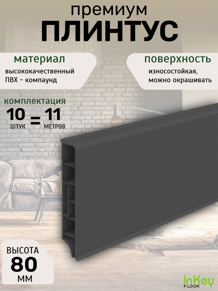 Комплектация: плинтус 10шт по 1,1 метра. Напольный плинтус прямоугольной формы – идеальное решение для создания эстетичного и функционального интерьера. Изготовленный из прочного пластика высокого качества, этот элемент отделки сочетает долговечность и стиль. Его конструкция из ПВХ-компаунда обеспечивает устойчивость к влаге, истиранию и перепадам температуры, что делает его подходящим для использования как в жилых, так и в коммерческих помещениях. Плинтус имеет мягкие края, которые плотно прилегают к поверхности пола и стен, скрывая неровности ремонта. Эта особенность не только повышает визуальную привлекательность пространства, но и защищает от попадания пыли и влаги. Высота 80 мм позволяет использовать его для оформления как классических интерьеров, так и современных дизайнерских решений. Одним из ключевых преимуществ этого напольного плинтуса является возможность окрашивания. Подготовив поверхность с помощью грунтовки, вы легко сможете нанести акриловую краску нужного оттенка, чтобы подчеркнуть стиль вашего интерьера или создать уникальный акцент. Это решение идеально подходит для кухни, гостиной или офисных пространств. Удобство монтажа также является важной характеристикой данного изделия. Универсальные соединители и углы позволяют быстро установить плинтус даже на сложных участках стен. Благодаря скрытой системе крепления он надежно фиксируется на поверхности без видимых зазоров между стеной и полом. Этот пластиковый плинтус отличается универсальностью: он может быть использован для кухонных фартуков, зоны столешницы или любых других помещений с повышенной влажностью. Легкость ухода делает его особенно практичным — достаточно протереть поверхность влажной тряпкой для удаления загрязнений.
