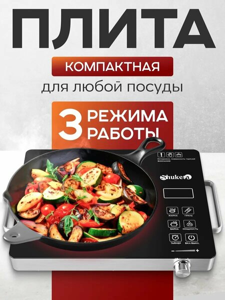 Настольная электрическая плита - это функциональная бытовая техника, которую отличает быстрый нагрев и равномерное распределение тепла, безопасность и комфорт работы, экономия электроэнергии. У одноконфорочной модели Shuketa с металлическим корпусом и ручками компактный размер: 360х280х61 мм, конфорка круглой формы, мощность до 3500 Вт, рабочая температура 60-700 градусов, наличие таймера (от 0 минут до 3:00 часов). Параметры электросети: 220-240В / 50Гц/ 1 фаза. Управление переносным устройством сенсорное и с помощью ручки регулятора. С помощью сенсорных кнопок - переключателей на панели управления черного цвета вы можете выбрать режим включения или выключения, а также режим жарки, варки или гриля, управлять параметрами мощности и электронного таймера. Мобильный аппарат с невысокими ножками и кабелем для подключения к сети удобен для использования в кухонном помещении общежития, на кухне дачного домика. Универсальную электроплиту в лаконичном дизайне выбирают в виде дополнительной для квартиры или дома. Она будет удобна для приготовления разных блюд, в том числе варки супа из мяса и овощей, для готовки блинчиков на завтрак или подогрева пищи (приготовленных ранее продуктов питания). Для стеклокерамической варочной поверхности инфракрасной плиты подходит практически любая посуда, но лучше выбирать небольшие модели с плоским дном (с диаметром дна 12-26 см). Посуду с маленьким диаметром дна рекомендуется ставить в центр зоны нагрева или ближе к заднему краю. Качественное нагревательное оборудование с регулируемой мощностью и индикатором ее показателей на панели радует стойкостью к давлению и температурным скачкам, легким уходом с помощью простой очистки стеклокерамического покрытия мягкой тканью с нейтральным чистящим средством. Обозначения на панели, инструкция и коробка выполнены на русском языке. Портативная электроплитка поставляется в фирменной коробочке для хранения. У нас есть акции и распродажи, вы можете купить наши товары в подарок со скидкой! "