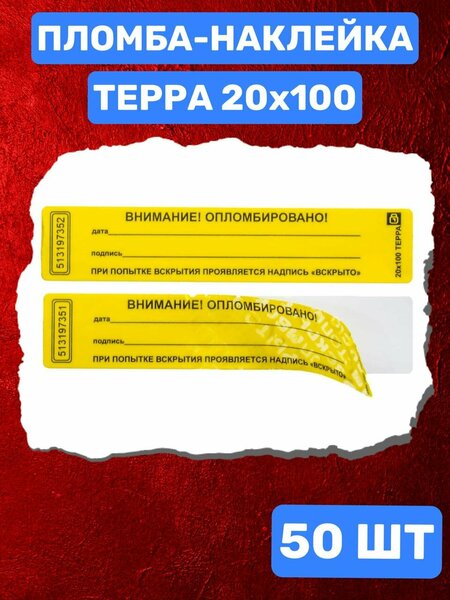 Наклейка Терра 20х100 подойдет для опечатывания любых поверхностей, не оставит следов, но обозначит факт вскрытия предупреждающей надписью на самой наклейке. Находят широкое применение, при опломбировании ценного имущества и лабораторного инвентаря, устанавливаясь на поверхности из металла, древесины, стекла, ДСП и кожзаменителя. Удаление пломбы не оставит следов на монтажной поверхности, но проявит на самой пломбе предупреждающий текст: "стоп, вскрыто!" — однозначным образом свидетельствующий о факте постороннего вмешательства. Примечательно, что любые попытки наклеить пломбу в исходное место и скрыть произошедшее не возымеют никакого результата. Высота 20 мм, Длина 40 мм, Температура установки от 0 до +45, Температура использования от -40 до +90. Безопасность, Для опечатывания, Защита, Надежность