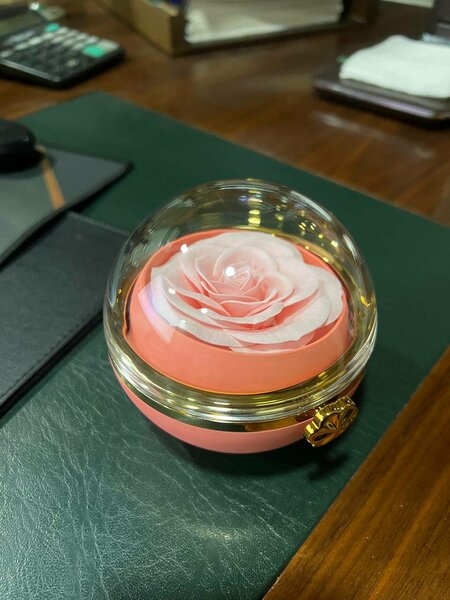 Подарочная шкатулка для кольца с декоративной розой под прозрачным куполом — эффектное решение для особенного момента. Оригинальный дизайн создаёт вау-эффект при вручении подарка и подчёркивает ценность украшения.