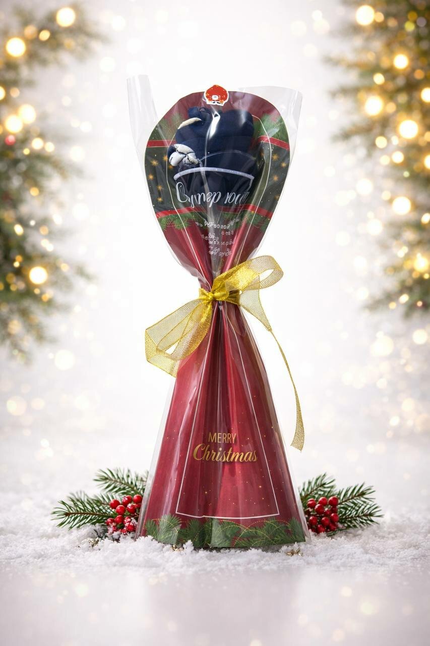 Этот праздничный подарочный набор представляет собой оригинальную композицию в виде аккуратно оформленного букета, внутри которого находятся мягкие, уютные новогодние носочки с ярким красно-белым полосатым узором и декоративным мотивом в виде милого рождественского персонажа. Набор оформлен в плотную подарочную упаковку глубокого винного цвета с новогодними еловыми элементами, украшен прозрачной защитной плёнкой и перевязан блестящей золотистой лентой, что придаёт ему дорогой, нарядный и по-настоящему праздничный вид. Носочки выполнены из плотного, приятного к коже материала, обеспечивающего тепло, комфорт и долговечность. Такой набор идеально подойдёт в качестве подарка к Новому году, Рождеству, зимним праздникам, а также станет красивым декоративным элементом, который можно вручить близким, коллегам, детям и взрослым. Букет-упаковка делает обычные носочки стильным и оригинальным подарком, который создаёт новогоднее настроение с первого взгляда.