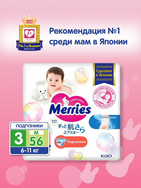 Японские подгузники Merries для суперактивных детей весом от 6 до 11 кг. Подгузники Merries с уникальной "дышащей" трехслойной технологией отлично выводят влажный воздух из подгузника. Позволяют коже оставаться сухой, снижая появление опрелостей и раздражений. Особенности: внутренний слой – благодаря уникальной структуре жидкость быстро превращается в гель, мгновенно поглощает, удерживает и распределяет влагу;"дышащая" пористая внутренняя поверхность – надежно задерживает жидкий стул, предотвращая растекание внутри подгузника и минимизирует контакт с кожей; воздух циркулирует между подушечек внутреннего волнистого слоя; внутри мягкая поверхность, контактирующая с кожей малыша, защищает ее от натирания; боковые бортики – плотно облегают ножки, предотвращают протекание и отлично держатся даже на очень подвижном ребенке; благодаря специальной системе для жидкости "замок" блокирует влагу внутри; многократные застежки-липучки с округлыми краями не травмируют кожу малыша; индикатор наполнения – полоски индикатора сигнализируют когда время заменить подгузник; привлекательный дизайн с зайкой Merries подарит малышу и родителям хорошее настроение; подходят для мальчиков и девочек.