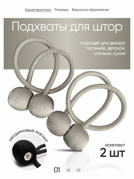 Хотите добавить индивидуальность и уют в интерьер своей квартиры или офиса? Придать вашему жилому помещению индивидуальный и уникальный стиль помогут подхваты для штор. Они отлично подходят для всех типов изделий, от сложных тканей до легких ширм. Зацепки удерживают тяжелые портьеры в гостиной, тюль в спальне и детской комнате, тонкие занавески на кухне. Декоративные прихваты на мощных неодимовых магнитах, что обеспечивает прочный способ крепления и надежно фиксируют захваты в любом месте шторки на выбранной высоте. Зажимы очень удобны и просты в использовании. Минималистичный дизайн клипс оригинально оформит оконные проемы загородного дома и дачи. С помощью держателей вы можете создать идеальное положение складок на материале, закрепить аксессуар так, чтобы он преподносил уровень комфорта. Их можно приобрести для собственного пользования, а также они будут красивым и нужным подарком. Длина веревки между шариками 40 см. Комплект состоит из 2 шт. В нашем магазине вы найдете и другие товары для вас и ваших близких на день рождения, новый год, новоселье и любой праздник. Благодарим за выбор и уверены, что ваши покупки будут приятными и полезными!