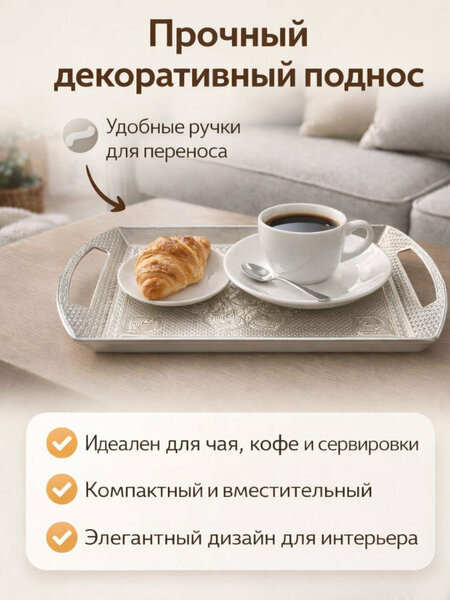 Поднос с утончённым декоративным узором станет центральным акцентом вашей сервировки. Он идеально подходит для подачи горячих напитков, сладостей и угощений, превращая каждое чаепитие в особый ритуал. Гармонично вписывается в интерьер гостиной, спальни или кухни, добавляя ощущение уюта, тепла и премиального стиля.