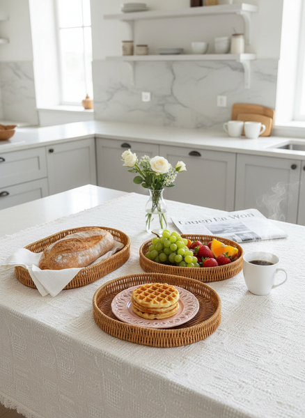 Этот стильный набор плетеных подносов из искусственного ротанга является прекрасным предметом для декорирования Вашего дома. Изготовленный из высококачественных материалов, каждый поднос имеет плетеную структуру, которая придает им особую изящность и неповторимый вид. Благодаря натуральной текстуре его приятно держать в руках. Поднос создает атмосферу комфорта и уюта. Этот набор подносов подходит не только для сервировки стола. Такой поднос можно использоваться для подачи гостям чая или кофе, кондитерских изделий, фруктов и овощей. Он идеально подходит для украшения вашего стола во время праздников пасхи и масленицы. Благодаря своей удобной форме и высоким бортикам, этот поднос декоративный станет незаменимым помощником в ванной комнате для хранения полотенец, косметики и других предметов. Подносы легкие и удобные в использовании, их можно легко перемещать и хранить. Кроме того, они прочны и стойки к повреждениям, поэтому прослужат долгое время. Добавьте элегантности и стиля в свой дом с этим подносом выполненным в скандинавском стиле и наслаждайтесь его красотой и функциональностью каждый день.