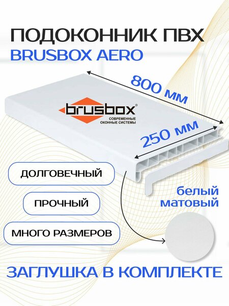Пластиковые подоконники BRUSBOX отличаются своей прочностью, полным соответствием государственным стандартам качества и безопасности. Кроме того, подоконники бренда «брусбокс» проверены временем. Подоконники BRUSBOX AERO представлены в белоснежном цвете. Угол капиноса подоконника BRUSBOX AERO - 90°; Изделия не боятся механических ударов. При уходе за стеклами и рамами на поверхность подоконника можно вставать ногами, устанавливать на него тяжелые предметы. Изделия не деформируются и не ломаются. Подоконник надежно защищен от термического воздействия, поэтому выдерживает эксплуатацию в диапазоне температур от -30 до +60 градусов по Цельсию. Уход за ними осуществляется с помощью подручных чистящих и моющих средств. Поверхность устойчива к царапинам и истиранию.