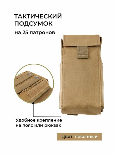 Подсумок отличается своей высокой функциональностью, прочностью и удобством использования. Благодаря своей универсальности и совместимости с системой MOLLE, этот тактический подсумок позволяет каждому пользователю настраивать его под свои индивидуальные потребности. Вы сможете легко присоединять и отсоединять дополнительные сумки и чехлы с помощью креплений, чтобы максимально адаптировать подсумок под конкретные задачи. Размеры подсумка составляют 22х12х5 см, что обеспечивает достаточно места для хранения до 25 патронов различных калибров. Внутри подсумка вшиты шесть эластичных лент, которые гарантируют надежную защиту патронов от механических повреждений. Внутренние ленты разделены на четыре ячейки, что упрощает их фиксацию и организацию. Этот подсумок изготовлен из высококачественного водонепроницаемого нейлона, что обеспечивает его долгий срок службы и полную защиту содержимого от влаги. Вы можете быть уверены, что ваши патроны будут в безопасности, даже при плохих погодных условиях. Закрывается этот подсумок клапаном на липучке, а также крепится с помощью двух лямок на кнопках. Такая система крепления делает использование подсумка максимально удобным и позволяет надежно закрепить его на поясном ремне, разгрузочном снаряжении, рюкзаке и других предметах. Тактический подсумок необходим и военным, и любителям стрельбы, страйкбола и охоты. Он поможет хранить и транспортировать ваши патроны, обеспечивая быстрый доступ к ним во время стрельбы. Более того, он также легко находит применение в различных видах спорта, таких как страйкбол, хардбол, охота и многих других. Не упустите возможность приобрести этот универсальный и надежный тактический подсумок. Он станет идеальным подарком для каждого мужчины, увлеченного охотой и военной тематикой. Покупайте и наслаждайтесь удобством и функциональностью этого уникального аксессуара!