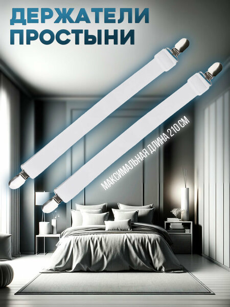 Держатели для простыни обеспечивают удобство и функциональность. Они подходят для простыней любых размеров и матрацев различной ширины и толщины. Каждый держатель оснащен двумя металлическими зажимами (крокодильчиками) с резиновыми зубчиками внутри, прочной резиновой лентой шириной 2,5 см и длиной 60 см, а также регулятором длины, позволяющим увеличить длину до 110 см и до 210 см при максимальном натяжении. Металлические зажимы многофункциональны: их можно использовать для крепления чехлов на креслах или диванах, для гладильных досок или даже для удержания скатерти на столе в ветреную погоду на даче. Эти держатели - отличный подарок на 8 марта и полезный предмет для дома, также они могут быть использованы как резинки для простыни, детские клипсы, зажимы или фиксаторы для простыни. Эластичные фиксаторы используются для ровной фиксации простыни на матрасе, придавая аккуратность и эстетический вид. Также держатели универсальны - подойдут для фиксации чехла на кресле, диване, гладильной доске или скатерти на столе. В комплекте 2 шт. Размеры: длина 110 см, максимальная длина при натяжении 210 см, ширина 2,4 см. Присутствует возможность регулировки длины, которая позволяет укорачивать или удлинять.