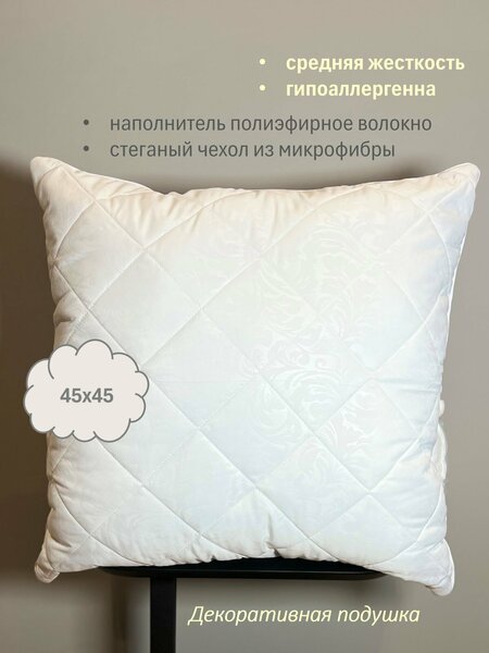 Подушка 45х45 Стандарт от Соната - это качественный и удобный аксессуар для вашего дома. Подушку доставят в вакуумной упаковке: Взбей, распуши её после распаковки! Оставь на время, она поднимется! И после с тобой нежно обнимется! Подушка выполнена в простеганном чехле с кантом, что придает ей дополнительную прочность и долговечность. Чехол изготовлен из полиэстера, который обладает высокой износостойкостью и простотой в уходе. Ткань чехла - микрофибра, что обеспечивает мягкость и комфорт при использовании. Наполнитель подушки - силиконизированное волокно, которое обеспечивает среднюю степень поддержки. Это позволяет вам чувствовать себя комфортно и расслабленно во время сна. Подушка имеет размеры 45х45 см, что делает ее удобной для использования на различных поверхностях. Белый цвет подушки подойдет к любому интерьеру и станет стильным дополнением к вашей спальне. Вес подушки составляет всего 0.4 кг, что делает ее легкой и удобной для транспортировки и хранения. Подушка 45х45 Стандарт от Соната - это сочетание комфорта, качества и стильного дизайна. Подушку доставят в вакуумной упаковке: Взбей, распуши её после распаковки! Оставь на время, она поднимется! И после с тобой нежно обнимется!