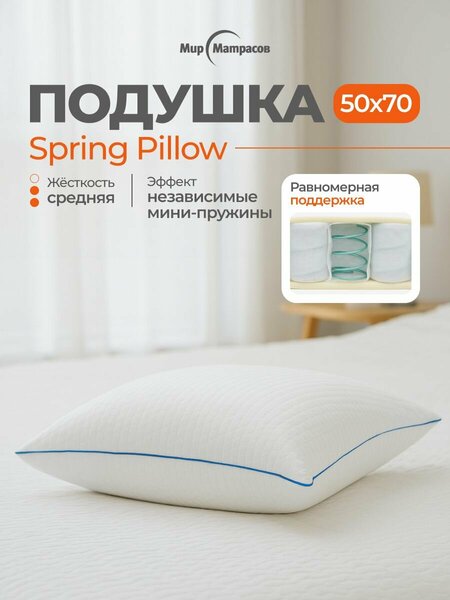Бренд Подушки Spring Pillow изменён с Askona на Мир Матрасов. Наименование бренда этого товара изменено с Askona на Мир Матрасов согласно политике компании о разделении продукции для маркетплейсов и собственных магазинов. Торговый знак Мир Матрасов принадлежит ООО "Торговый Дом Аскона". Продукция выпускается на том же предприятии и из тех же материалов, что и ранее. Вам может быть доставлен продукт как с логотипом Askona, так и с новым логотипом Мир Матрасов, т. к. на складах все еще много продукции, произведенной до изменения бренда. Подушка Spring Pillow с пружинным блоком в основе обеспечивает мягкую равномерную поддержку во время сна. Каждая пружина находится в отдельном мешочке и гибко реагирует на малейшее движение, обеспечивая комфорт и поддержку в любой позе. Она также обладает расслабляющим эффектом и сохраняет поддерживающие свойства благодаря пружинному блоку. Эта подушка подходит для любого положения тела во время сна.