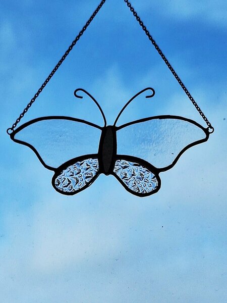 Размер изделия без цепочки 10х7 см. Подвеска интерьерная бабочка. Производится полностью вручную по витражной технологии "Тиффани.", которой более 100 лет. Состав художественное цветное и фактурное бесцветное стекло, металл. Этот маленький витраж очень оригинально будет смотреться на вашем окне около комнатных цветов. В комплект входит самоклеящийся пластиковой крючок, для фиксации на окне. Уход: можно мыть средством для стекла и зеркал. Вытирать насухо мягкой тряпочкой. Упаковка: транспортировочная коробка из гофрокартона. При получении продукции из стекла в ПВЗ или у курьера проверяйте все стеклянные изделия на целостность. Изделие не должно быть со сколами, трещинами, царапинами или разбито. В противном случае претензии на возврат приниматься не будут.