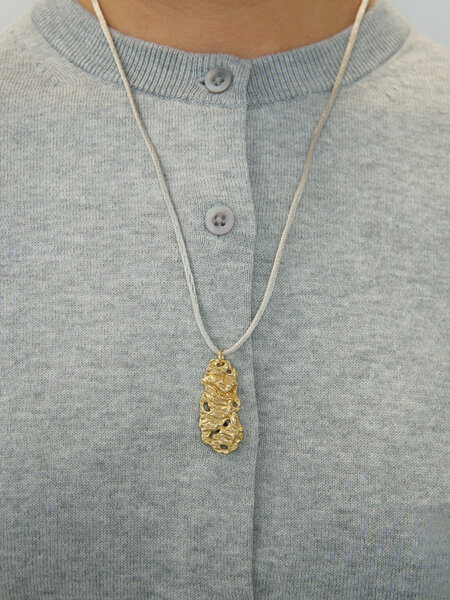 Подвеска из чистой латуни в виде кусочка расплавленного золота на сером сатиновом шнурке. Со временем чистая латунь приобретает иной цвет с винтажным эффектом.