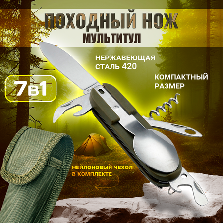 Походный нож мультитул 7-в-1. Отличный аксессуар для походов, пикников, выживания, охоты или рыбалки, сочетающий в себе 7 предметов - нож, ложку, вилку, шило для плетения, штопор, открывашки для бутылок и консерв. Недорогой компактный нож заменит громоздкий и дорогой набор! Характеристики походного ножа-мультитула: Материал – нержавеющая сталь 420; Твердость закалки клинка – 54-55 HRC; Материал корпуса – ударопрочный пластик; Цвет – олива; Габариты в сложенном виде – 100 х 25 х 25 мм; Длина основного лезвия – 75 мм; Ложка – 100 х 30 мм; Вилка – 100 х 22 мм; Вес – 145 г. Материал чехла – нейлон 600D.