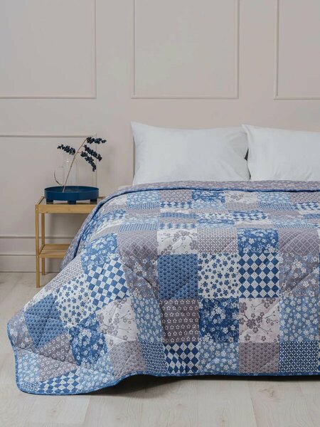 Покрывало очень приятное на ощупь, потому что оно изготовлено из перкали — ткани, в которой используются нити с высокой пряжей из 100% хлопка высшего сорта. Для окрашивания ткани используются безопасные красители европейского производства. Это позволяет использовать покрывало не только в качестве декоративного элемента, который подчеркнёт стиль и уют вашего дома, но и как плед для уютных вечеров с горячей кружкой травяного чая у окна. Покрывало безопасно для тела, что подтверждается сертификатами качества и соответствием госту. Оно имеет размер 180-220 см и стёганую структуру. У покрывала есть две лицевые стороны с обработанным краем «кант». Также представлены покрывала в одном тоне с подушками. «Мадам Текстиль».