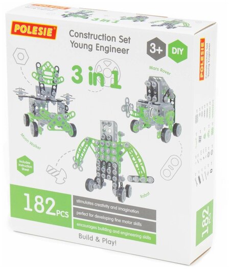 Конструктор «Изобретатель» (182 элемента) (в коробке) от фабрики «Полесье» создан специально для маленьких изобретателей. Элементы выполнены в виде планок с отверстиями. Планки соединяются между собой при помощи болтов и гаек. В комплект входит подробная инструкция, следуя которой можно создать модели, представленные на упаковке игрушки. Игра с конструктором не ограничивается сборкой исключительно по инструкции. Юные новаторы всегда могут дать волю своей фантазии и создавать что-то новое. Игры с конструктором могут определить будущую профессию малыша, раскрыв в нём творческий потенциал. Все конструкторы серии «Изобретатель» совершенно разные, поэтому из них можно собрать целую коллекцию, которая превратится в творческую мастерскую Вашего ребёнка!
