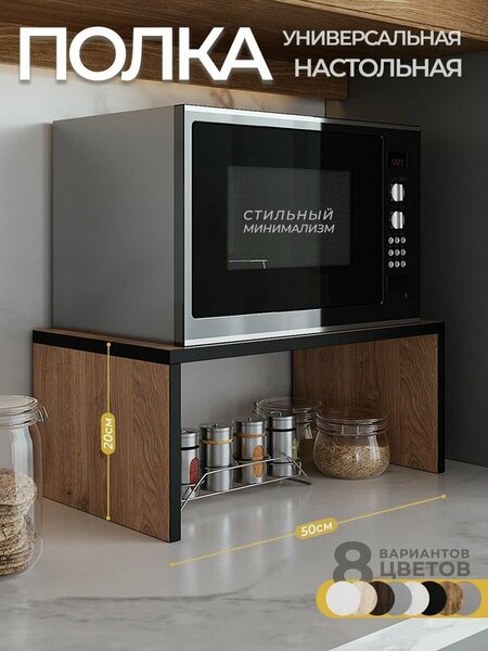 Настольная полка под микроволновую печь станет настоящим помощником для кухни, поскольку она не только решает проблему хранения, но и обеспечивает легкий доступ к необходимым принадлежностям. Благодаря продуманному дизайну, полка для кухни гармонично вписывается в любой интерьер, добавляя стиль и функциональность. Она обеспечивает возможность разместить не только микроволновку, но и другие приборы, сохраняя при этом порядок на рабочей поверхности. Удобное распределение пространства позволяет эффективно использовать каждый сантиметр, что особенно важно для малогабаритных кухонь. Дополнительные полки идеально подходят для хранения баночек с приправами и соусами, а также для аксессуаров, которые всегда должны быть под рукой. Таким образом, процесс готовки станет более комфортным и быстрым. Сочетание прочных материалов и современного дизайна гарантирует долговечность и надежность данного изделия. ЛДСП 16 мм, из которого изготовлена полка для кухни, обеспечивает стабильность и устойчивость даже при высокой нагрузке, что позволяет не переживать за сохранность техники. Полка для специй и свч — это не только удобство, но и элегантное решение в категории " все для кухни ". Размеры полки для принтера: ширина - 50 см, глубина - 29,5 см, высота 20 см. Кроме того, полка мебельная может служить не только практическим элементом, но и декоративным. На ней можно выставить не только бытовые приборы, но и элементы декора, книги, ноутбук, что придаст пространству больше уюта и стиля. Выбирая полку от "Философия уюта", вы выбираете качество, стиль и удобство для вашего дома.