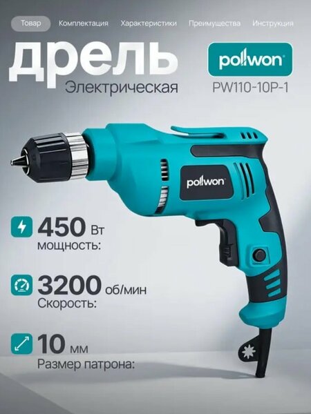 Pollwon PW110-10P-1 Мощность: 450 Вт Скорость: до 3200 об/мин Патрон: 10 мм