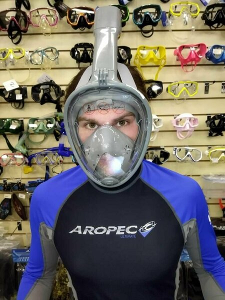 Маска полнолицевая - революционная маска: Чудо-маска-трубка-беруши защищает от воды все: рот, нос, уши и глаза! Не запотевает, имеет колоссальный обзор, а главное, не требует навыка дыхания только ртом! Это позволяет надевать ее на любого купающегося и не волноваться, что в момент созерцания подводных красот он нахлебается воды, даже если купающийся ребенок или взрослый первый раз попавший в воду! Характеристики полнолицевой маски: Технологичная полнолицевая маска для сноркелинка. Инновационный, простой в употреблении продукт весом всего 396 грамм. Линза маски и обтюратор из LSR (технология «жидкая кожа») антиаллергенного силикона анатомической формы, обеспечивают безупречное прилегание маски к лицу, что позволяет избежать попадания воды под маску. Трубка-воздуховод с автоматическим клапаном, выведена вверх и не пропускает воду под маску в момент погружения, обеспечивая беспрепятственный проход воздуха, когда пловец находится на поверхности воды. Такая конструкция дает возможность естественного дыхания и ртом, и носом как на поверхности. Подмасочное пространство маски разделено на зоны, перегородка между которыми снабжена односторонними клапанами, обеспечивающими циркуляцию воздуха, что позволяет избежать запотевания маски без использования специальной пленки и химических средств-антифогов. Эргономичная форма визора гарантирует абсолютный обзор более 180 гр. Маска снабжена берушами из антиаллергенного силикона для затыкания ушей и предотвращения попадания воды в слуховой проход и на барабанную перепонку. Держатели маски (ремешки) выполнены из текстиля.