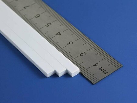 Полоска длиной 35 см из белого пластика. Хорошо обрабатывается и клеится полистирольным клеем. Сечение 2.5х4.8 мм.