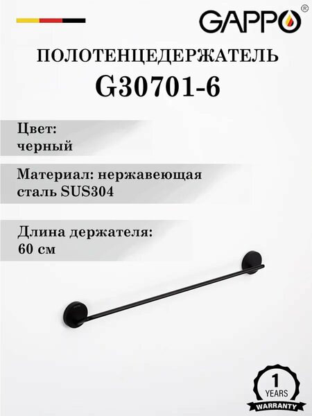 Полотенцедержатель одинарный Gappo G30701-6 - стильный и функциональный аксессуар для вашей ванной комнаты или туалета. Изготовлен из высококачественной нержавеющей стали, что обеспечивает долговечность и надежность использования. Цвет черный придает аксессуару изысканный и современный вид. Полотенцедержатель оснащен квадратной формой и имеет размеры 5.0 см в высоту, 6.7 см в ширину и 60.0 см в длину. Это позволяет разместить на нем достаточное количество полотенец, обеспечивая комфорт и порядок в ванной комнате. В комплекте с полотенцедержателем идет набор для крепления, что делает установку быстрой и простой. Крепление осуществляется с помощью шурупов, что гарантирует надежное и прочное крепление аксессуара к стене. Выбирая полотенцедержатель одинарный Gappo G30701-6, вы получаете стильный, функциональный и надежный аксессуар для вашей ванной комнаты или туалета, который будет радовать вас своим внешним видом и практичностью на протяжении долгого времени.