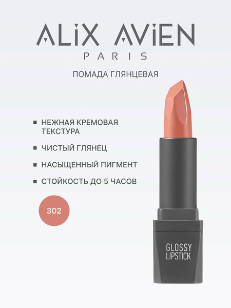 Помада для губ ALIX AVIEN глянцевая в оттенке нюдовый № 302 от Alix Avien Paris. Помада для создания соблазнительных губ с успокаивающей кремовой текстурой. Насыщенный пигмент и стойкость делают помаду универсальной и незаменимой. Особенная мягкая формула помады для губ обеспечивает легкое и контролируемое нанесение при макияже, создавая равномерную и приятную идеально прилегающую пленку. Помада аликс авьен наносится гладко и равномерно, обеспечивая плотное покрытие и очаровательный финиш всего одним движением. Благодаря витамину Е, содержащемуся в помаде, губы остаются шелковистыми и мягкими. Пчелиный воск, обладает сильным противовоспалительным и регенерирующим действием, питает и смягчает кожу губ, придавая продукту защитные свойства. Масло подсолнуха оказывает смягчающий и успокаивающий эффект, защищает от последствий ультрафиолетового излучения. Подходит для всех типов. Без парабенов и глютена. Продукт протестирован дерматологами.