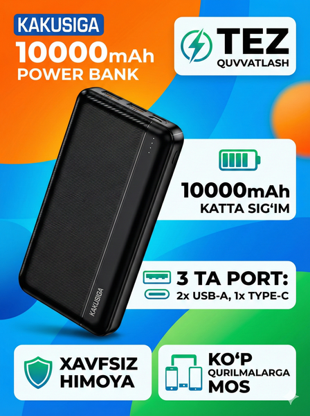 Дополнительная информация о внешнем аккумуляторе Kakusiga KSC-1084: 1. Технические характеристики: • Тип аккумулятора: литий-полимерный • Емкость: 10 000 мАч • Выходная мощность: 5 В/2 А (максимум 10 Вт) • Входное напряжение: 5 В/2 А (Type-C и Micro USB) • Порты: • 2 выходных порта USB-A • 1 входной порт Type-C • 1 входной порт Micro USB • Светодиодные индикаторы: Да (для отображения заряда аккумулятора) • Материал корпуса: ABS + PC (огнестойкий пластик) • Размеры: приблизительно 135 × 67 × 15 мм • Вес: 220 г 2. Преимущества: ✅ Легкая и компактная конструкция — удобно носить с собой. ✅ Возможность одновременной зарядки 2 устройств. ✅ Широкая совместимость — работает со всеми смартфонами, планшетами и другими USB-устройствами. ✅ Система защиты - защита от перезаряда, перегрузки по току и короткого замыкания.