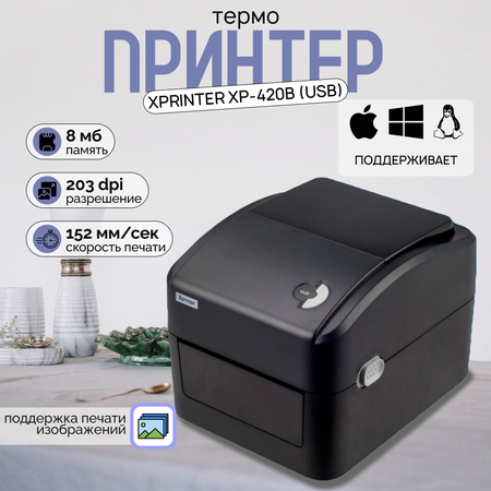 Xprinter XP-420B (USB) Черный используется для печати этикеток, штрих-кодов на бумаге шириной до 110 мм. Применяется в торговых, складских, почтовых, логистических организациях. Сменная термоголовка обеспечивает разрешение печати 203 dpi. Скорость печати может достигать 157 мм/сек. Принтер совместим со всеми складскими программами. Предусмотрен USB-порт, с помощью которого прибор можно подключить к ПК или ноутбуку, а также интегрировать его в общую сеть организации. Не используется для печати кассовых чеков.