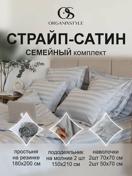 Комплект постельного белья из 100% хлопка страйп сатина с жаккардовым узором в виде матовых и глянцевых полос шириной 3 см цвет Светло-серый. Комплект создан для ценителей комфорта и классической эстетики. Светло-серый цвет создаст уют и привнесёт нотки утончённой роскоши в интерьер спальни. Однотонный стильный комплект постельного белья изготовлен из натурального 100% хлопка сатина с жаккардовым узором в виде полос 3х3 см. Благодаря сатиновому переплетению нитей ткань обеспечивает комфорт и удобство во время сна, прекрасно пропускает воздух. Гипоаллергенна и безопасна для чувствительной кожи. Высокая плотность плетения 300 ТС обеспечивает износостойкость и долговечность комплекта. Комплектация: • Пододеяльник (2шт): 150×220±3 см • Простыня на резинке (1шт): 180×200±3 см • Наволочка "ушки" с двух сторон (2шт): 50×70±2 см. Наволочка "ушки" с двух сторон (2шт): 70х70 см