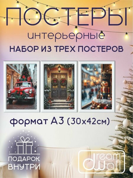 Постеры новогодние "Праздничное настроение", А3 (30х42), комплект из 3 шт. Создайте волшебную атмосферу праздника в вашем доме с нашим эксклюзивным комплектом новогодних постеров "Праздничное настроение"! Этот набор из трех великолепных постеров формата А3 (30х42 см) станет идеальным украшением для вашей гостиной, детской комнаты, офиса или любого другого пространства, которое вы хотите наполнить предновогодним волшебством. Каждый постер тщательно отобран, чтобы передать всю теплоту, радость и уют любимого праздника. В комплекте вы найдете три уникальных сюжета: "Машина с подарками и елкой": Представьте себе уютную сцену, где старинная машина, украшенная гирляндами, везет пушистую елку и гору подарков по заснеженной дороге. Этот постер мгновенно перенесет вас в атмосферу предвкушения праздника и радостных ожиданий. Он идеально подойдет для создания ностальгической и теплой атмосферы. "Новогодние двери с венками": Откройте для себя очарование традиционных новогодних дверей, украшенных пышными зелеными венками с красными бантами и шишками. Этот постер излучает гостеприимство и приглашает в мир праздничных чудес. Он добавит элегантности и классического новогоднего шарма вашему интерьеру. "Щелкунчик": Погрузитесь в сказку с изображением знаменитого Щелкунчика. Этот символ новогодних праздников, выполненный в ярких и детализированных красках, привнесет в ваш дом дух волшебства и детской мечты. Он станет прекрасным дополнением к любому декору, особенно если в доме есть дети. Преимущества нашего комплекта постеров: