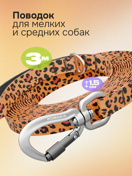 Поводок леопардовый для собак 3 м из нейлоновой стропы с алюминиевым карабином. Надёжный и лёгкий поводок для собак мелких и средних пород. Изготовлен из прочной нейлоновой (тканевой) стропы шириной 1,5см и длиной 3 метров — материал устойчив к износу, легко отстирывается и сохраняет яркий внешний вид даже при активной эксплуатации. Карабин из авиационного алюминия выдерживает нагрузку до 250 кг и оснащен ручной блокировкой от случайного открытия. Мягкая неопреновая вставка внутри ручки снижает давление на руку и повышает комфорт при рывках. Все соединения дополнительно прошиты прочной нитью — для максимальной надёжности и долговечности. Подходит для ежедневных прогулок, дрессировок и активных игр. Совместим с ошейниками и шлейками бренда Kusaka.