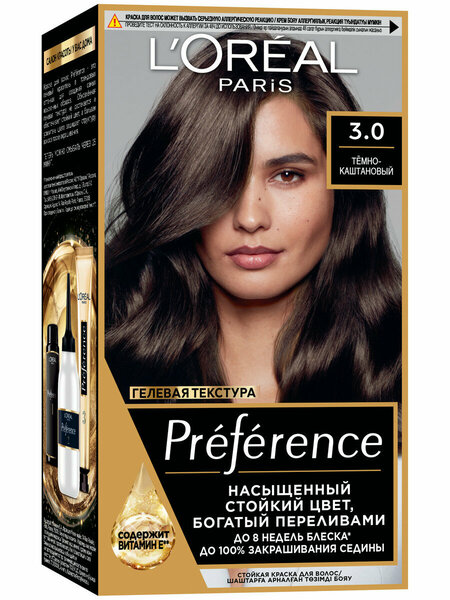 L'Oreal Paris представляет стойкую краску для волос из линейки Preference. Этот продукт обеспечивает премиальное качество окрашивания и дарит неповторимый яркий цвет. Цвет 3 «Бразилия» (Тёмно-Каштановый) добавит вашим волосам красивый шёлковый блеск. Объём упаковки составляет 174 мл.