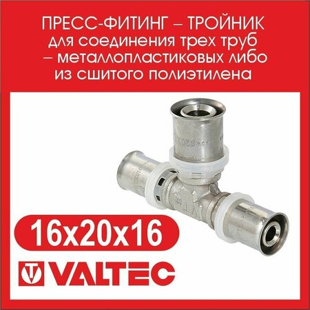 (VTm.231. N) Пресс-фитинг – тройник предназначен для соединения трех труб – металлопластиковых либо из сшитого полиэтилена. Корпус выполнен из сантехнической латуни марки CW617N, уплотнительные кольца штуцеров – из EPDM плотностью 1,22 г/см3, пресс-гильзы – из нержавеющей стали. Нейлоновая обойма выполняет функции фиксатора гильзы, направляющей для пресс-насадок и диэлектрической прокладки, прерывающей контакт между алюминием трубы и латунью корпуса. Конструкция пресс-фитингов VALTEC обеспечивает повышенную пропускную способность, надежность соединений, прочность и термостойкость. Монтаж фитинга производится пресс-инструментом с насадкой «ТН». Типоряд содержит равнопроходные и переходные пресс-тройники.