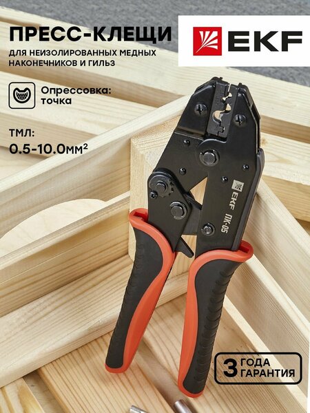 Компания EKF представляет инструмент для опрессовки изолированных и неизолированных наконечников, а также разъёмов. Пресс-клещи, оснащенные храповым механизмом, обеспечивают блокировку обратного хода и полный цикл опрессовки. Пресс-клещи pk-05-exp предназначены для ТМЛ наконечников сечением 0,5-10 мм2. Инструмент оснащен храповым механизмом с автоматической разблокировкой по завершению цикла опрессовки. Каждая модель имеет маркировку, указывающую значение сечения используемого наконечника или разъема, а также нанесенную цветовую маркировку, соответствующую цвету изолирующей манжеты. Профиль опрессовки - точка. Применяются для работ по обжимке многожильных кабелей и проводов. Степень опрессовки определяет механическую прочность и электрическое сопротивление контактного соединения. Инструмент используют для соединения наконечников на автомобильной проводке, для оконцевания кабеля перед подключением к электрощиту или потребителю и т. д.