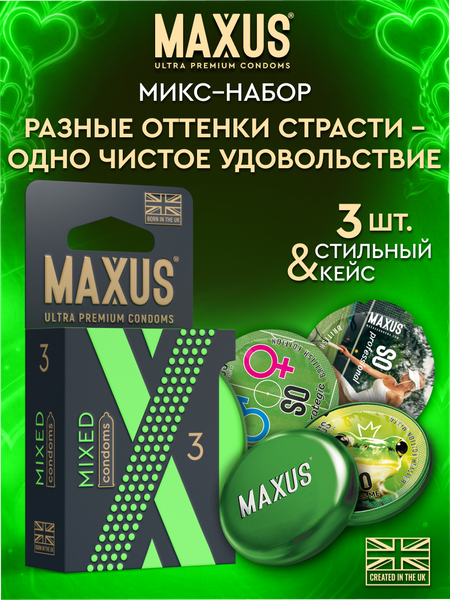 Maxus Микс-набор создан специально для экспериментаторов и позволяет попробовать все наиболее популярные презервативы бренда. В коллекции 108 дизайнов блистеров, которые подойдут под любой образ и ситуацию. В подарок к каждой упаковке прилагается стильный кейс, с которым точно удастся не упустить момент. Сами презервативы изготавливаются из натурального премиум латекса и проходят 5 этапов тестирования. Технология ULTRASENSETEX позволяет полностью отдаться процессу, не чувствуя преград. Комплектация упаковки: презервативы 1 шт. Maxus Ультратонкие, 1 шт. Maxus Классические, 1 шт. Maxus Точечно-ребристые. Maxus - самые лучшие презервативы по ощущениям.