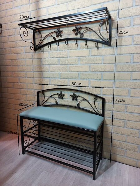 Кованая прихожая №04 (вешалка+банкетка). Размер: ширина 80 см. Нагрузка 300 кг. В вешалке используются материалы: труба профильная 15х15 мм, 20х20 мм, пруток 6х10мм. Описание: Кованые прихожая от производителя! Отличное качество, ручная работа! Санкт-Петербург. "Студия кованой мебели НиВа" Гарантия 10 лет на металл. Ручная работа, горячая ковка. Сварка используется по периметру сварных соединений, что значительно повышает прочность. Покраску используем порошковую, + патина (Италия) что значительно повышает износостойкость. Будем благодарны за Ваш отзыв!