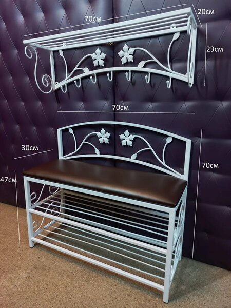 Кованая прихожая №04 (велюр ) (вешалка+банкетка). Размер: ширина 70 см. Нагрузка 300 кг. В вешалке используются материалы: труба профильная 15х15 мм, 20х20 мм, пруток 6х10мм. Описание: Кованые прихожая от производителя! Отличное качество, ручная работа! Санкт-Петербург. "Студия кованой мебели НиВа" Гарантия 10 лет на металл. Ручная работа, горячая ковка. Сварка используется по периметру сварных соединений, что значительно повышает прочность. Покраску используем порошковую, + патина (Италия) что значительно повышает износостойкость. Будем благодарны за Ваш отзыв!