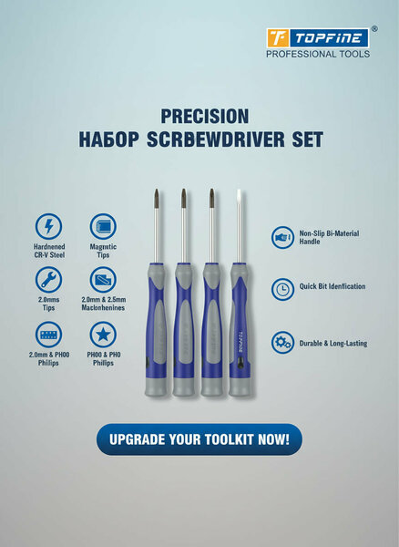 Профессиональный набор отверток TOPFINE предназначен для мелкой и точной работы. В набор входят 4 различных насадки, которые очень удобны для ремонта электроники, телефонов, ноутбуков, часов, очков и других деликатных устройств. Насадки изготовлены из прочной хромованадиевой стали (CR-V), что обеспечивает длительный срок службы и износостойкость. Эргономичная прорезиненная рукоятка не скользит и удобно лежит в руке. В набор входят: Плоская: 2,0 мм Плоская: 2,5 мм Наконечник: Φ0 Наконечник: Φ00 Преимущества: Профессиональное качество Прочный материал Удобная рукоятка Идеально подходит для мелкой техники Компактный и удобный для переноски