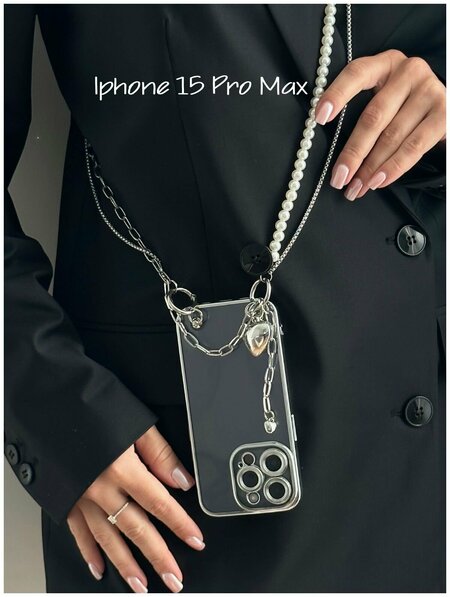 Чехол на iPhone 15 Pro Max с жемчужным ремешком-сотуаром - стильный и функциональный аксессуар для вашего смартфона. С помощью жемчужной цепочки можно носить телефон на плече или на шее. iPhone всегда под рукой и вы выглядите красиво и стильно. Case из высококачественных материалов, обеспечивает надежную защиту вашего устройства от царапин, ударов и других повреждений, зашита камеры. Прозрачный дизайн чехла для смартфона позволяет сохранить оригинальный вид вашего мобильного телефона , а серебристый цвет окантовки придает устройству элегантный и современный вид. Искусственный жемчуг на чехле добавляет изысканности и стиля, делая ваш смартфон еще более привлекательным. Чехол изготовлен из силикона, что обеспечивает долговечность и прочность аксессуара. Цепочка декорирована брелками: большим сердцем, металлические карабины цепочки при необходимости отстегиваются, что позволит Вам использовать сотуар отдельно, без телефона. Выбирая чехол с жемчужным ремешком, вы получаете стильный, надежный и функциональный аксессуар, который будет служить вам долгое время и подчеркнет ваш индивидуальный стиль. Аксессуар упакован в стильную фирменную коробочку.