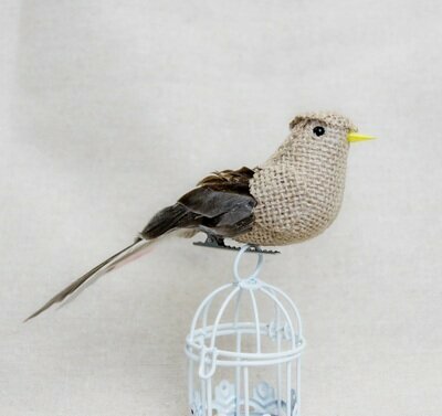 Две птички из рогожки и коричневых перьев Внизу птички предусмотрена металлическая клипса для того, чтобы она удобнее крепилась.