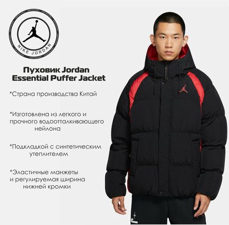 Мужская куртка Jordan Essential Puffer Jacket. Актуальный городской пуховик, вдохновленный дизайном классической спортивной куртки AJ1 Wings. Модель имеет прямой крой и изготовлена из легкого и прочного водоотталкивающего нейлона. Куртка застегивается на молнию со штормовым клапаном на кнопках и обладает подкладкой с синтетическим утеплителем. Оснащена просторным регулируемым капюшоном, двумя внешними и одним внутренним карманами. Эластичные манжеты и регулируемая ширина нижней кромки. На груди расположен логотип бренда. Первоклассная зимняя куртка, которая идеально подойдет для создания образа с кроссовками. Особенности