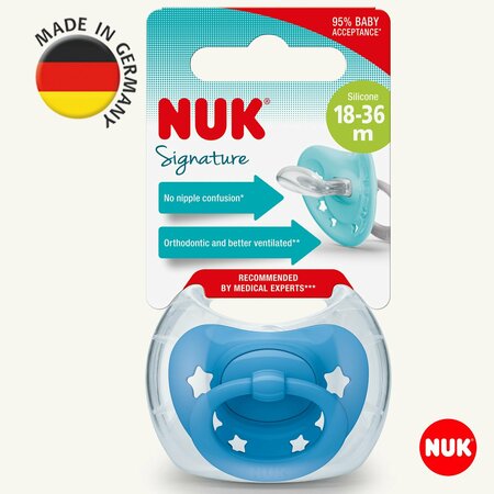 Соска-пустышка NUK Signature ортодонтической формы из силикона для детей 18 мес, размер 3• Улучшенная оригинальная форма NUK, смоделированная по подобию соска материнской груди в момент кормления, идеально адаптируется под челюсть ребенка во время сосания • Более тонкая и узкая пустышка уменьшает давление на челюсти и зубы• Плоская и мягкая нижняя часть, приятные ощущения во рту, много места для естественных сосательных движений• Не содержит Бисфенол-А• Произведено в Германии• Для детей от 6 до 18 мес. • С воздушным клапаном NUK Air System – чтобы пустышка не слипалась. Новая силиконовая соска-пустышка NUK Signature: смоделирована по подобию соска материнской груди в момент кормления. Ежедневно ваш малыш сталкивается с огромным количеством захватывающих открытий и приключений. И на этом пути его сопровождает соска-пустышка, которая является надежным другом, создает ощущение безопасности и защищенности, может успокоить. Будь то незнакомые лица, звуки или окружение, которые взволновали вашего малыша, знакомое инстинктивное сосание соски-пустышки быстро снова расслабит его. Чтобы еще больше оптимизировать фактор хорошего самочувствия, NUK – изобретатель ортодонтической формы соски, оптимально подходящей для челюсти, сделал оригинальную форму еще лучше. Форма смоделирована по подобию соска материнской груди в момент кормления, и идеально адаптируется под челюсть ребенка во время сосания. Особенность этой соски в том, что она еще более тонкая и узкая - чтобы уменьшить давление на зубы и челюсти. Уплощенная сосательная часть и вогнутая нижняя поверхность обеспечивают приятное ощущение во рту и дают языку достаточно места для естественных сосательных движений. Соски NUK оптимально подходят для ротовой полости и поэтому принимаются детьми особенно быстро*. Таким образом, они обеспечивают отдых как для детей, так и для их родителей. Рекомендовано экспертами: новые пустышки NUK успокаивают лучше, чем когда-либо прежде. Поскольку общее здоровое развитие вашего ребенка очень важно для нас, мы бы хотели, чтобы у каждого ребенка была соска-пустышка, близкая к природе и подходящая для челюсти. С этой соской идеально сочетаются клипсы (держатели): -103786654916 NUK Держатель (Клипса) для соски-пустышки с лентой, Микки Маус -103701622968 Ленточка-держатель для соски-пустышки с клипсой, бежевая -103701622967 Ленточка-держатель для соски-пустышки с клипсой, голубая -103701622966 Ленточка-держатель для соски-пустышки с клипсой, зелёная -103701622969 Ленточка-держатель для соски-пустышки с клипсой, розовая -4611617692 Клипса для соски-пустышки с лентой, Винни Пух -4611674832 Клипса (держатель) для соски-пустышки с цепочкой, синяя -4611619053 Клипса (держатель) для соски-пустышки с цепочкой, розовая -4611635253 Клипса (держатель) для соски-пустышки с цепочкой, зелёная -4611527153 Клипса (держатель) для соски-пустышки с цепочкой, бежевая