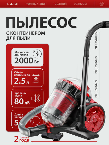Пылесос бытовой Normann AVC-212: мощная и эффективная уборка Мощный и эффективный пылесос Normann AVC-212 предназначен для сухой уборки. Благодаря циклонной технологии - мультициклон, пылесос обеспечивает стабильную силу всасывания и эффективное разделение пыли. Мощность пылесоса составляет 2000 Вт, а мощность всасывания - 380 Вт, что позволяет легко справляться с уборкой ковров, полов и мягкой мебели. Объем пылесборника пылесоса составляет 2,5 литра. Контейнер для пыли легко снимается и опорожняется, а фильтр легко извлекается и очищается. Пылесос оснащен автоматическим сматыванием шнура длиной 5 метров, что упрощает его хранение и использование. Также имеется встроенный регулятор мощности и индикатор заполнения контейнера, предупреждающий о необходимости очистки. В комплекте с пылесосом идут щелевая насадка, универсальная насадка для сухой уборки, удлинительная трубка/шланг и телескопическая трубка. Особенности конструкции пылесоса включают индикатор заполнения пылесборника и ножной переключатель вкл./выкл. Технические характеристики пылесоса включают номинальную мощность 1600 Вт, класс защиты II и радиус действия 8 м. Электропитание осуществляется от сети 220-240 В ~ 50 Гц. Пылесос выполнен в черном и красном цвете, имеет вес 5 кг и габариты 28х25х35 см.