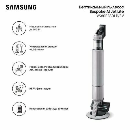 Пылесос ручной Samsung VS80F28DLP/EV обеспечивает сухую уборку с мощностью всасывания до 280 Вт и максимальной потребляемой мощностью 800 Вт. • Литий-ионный аккумулятор Полная зарядка занимает до четыре часов, после чего прибор готов к работе в любом уголке дома. • Четыре режима работы, включая «Турбо» Можно выбрать оптимальный для разных типов покрытий и уровня загрязнения. • Пять насадок В комплекте — выдвижная щелевая для труднодоступных мест, комбинированная щелевая-щетка, турбощетка для ковров и ворсистых поверхностей, гибкая насадка для удобного маневрирования и специальная насадка для сбора шерсти. • Моющийся HEPA-фильтр Улавливает мельчайшие частицы пыли и аллергены. • Электронное управление Обеспечивает точный контроль силы всасывания. Уровень шума не превышает 87 дБ. Предусмотрено защитное отключение при перегреве. Пылесос оснащен подставкой для вертикальной парковки.