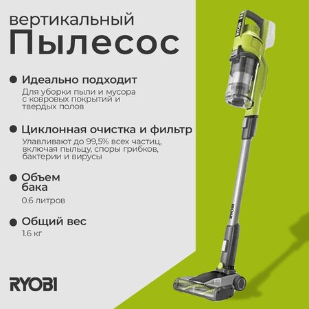 Технические характеристики; Ryobi RSV18-120G 5133005658 Объем бака; 0.6 л Автоматическое сматывание кабеля; нет Тип пылесоса; вертикальный Вертикальный; есть Тип пылесборника; контейнер Типы насадок в комплекте; удлинительная штанга; щелевая насадка; круглая насадка; роликовая насадка с приводом Тип питания; аккумулятор Мощность всасывания; 30 Вт Щетка с подсветкой; нет Турбощетка в комплекте; да Возможность влажной уборки; нет Моющий; нет Труба для всасывания; цельная Отсоединяемый ручной пылесос; да Беспроводной; да Основной цвет; черный/зеленый Время заряда; 60 мин Тип аккумулятора; Li-lon Количество аккумуляторов в комплекте; 1 Емкость аккумулятора; 2 А*ч Ранцевый; нет Вес нетто; 1.6 кг Габариты без упаковки; 450х200х120 мм Напряжение; 18 В Расход воздуха; 13.7 л/с